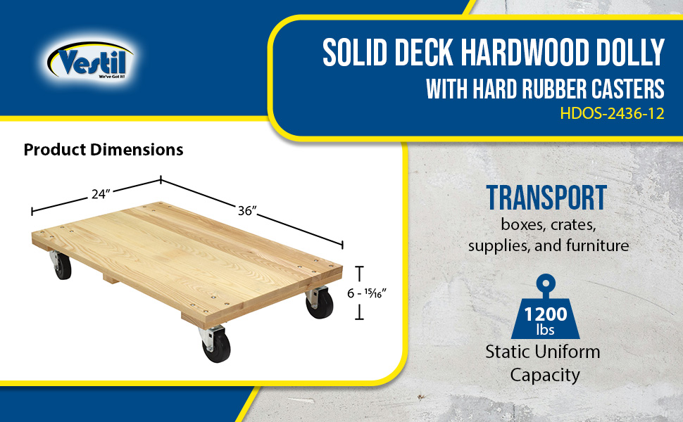 | Hardwood Solid Deck Dolly with Non Marking Casters 36 In. x 24 In. x 6-15/16 In. 1200 Lb. Capacity | Uniform Static Capacity (lb.): 1,200 Deck Width (in.): 24 | 35 |
