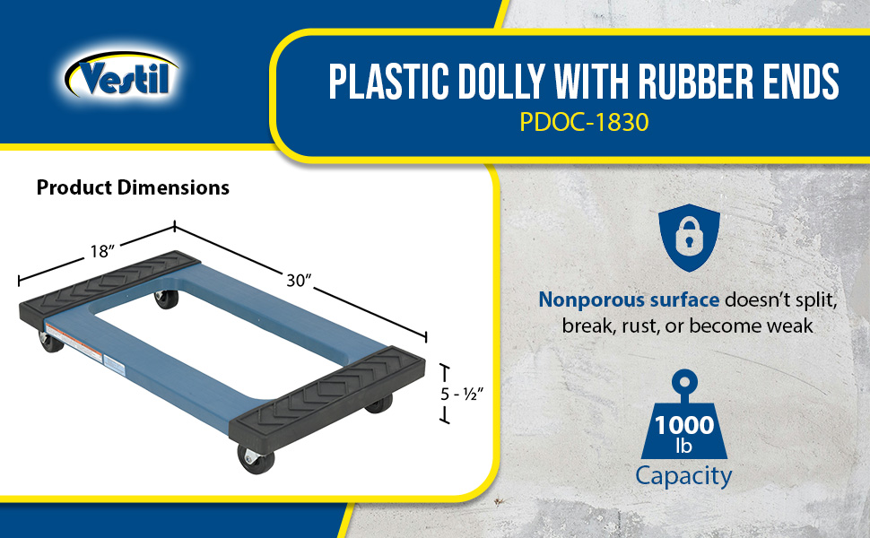 PDOC-1830 PDOC-1830Plastic Dolly with Rubber Ends 30 In. x 18 In. x 5-1/2 In. 1000 Lb. Capacity BlueUniform Static Capacity (lb.): 1,000