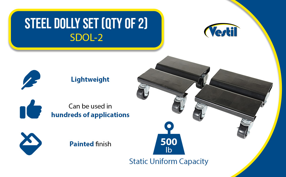 SDOL-2 SDOL-2Steel Dolly Set 2 Quantity 8 In. x 8 In. x 3-5/8 In. BlackUniform Static Capacity per dolly (lb.): 500