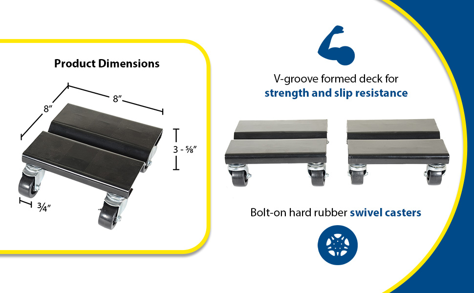SDOL-4 SDOL-4Steel Dolly Set 4 Quantity 8 In. x 8 In. x 3-5/8 In. BlackUniform Static Capacity per dolly (lb.): 500