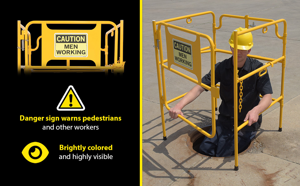 MHGR-32-SI-C-01 MHGR-32-SI-C-01Steel Manhole Guard Rail with Aluminum Sign 31 In. x 30 In. Caution Men Working Sign Message YellowUsable Width/Length (in.): 31 x 30