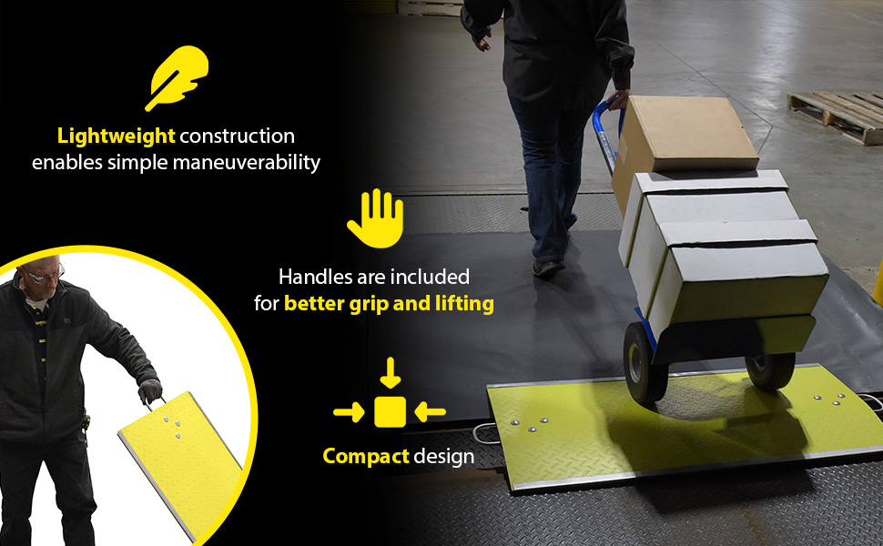 FGDP LightweightA Fiberglass Dockplate is a simple and manageable way to bridge the gap between areas. A lightweight construction enables simple maneuverability, while the brightly colored anti-slip design supports visibility when approaching entries and exits. A handle is included on either side for a more even lifting. A metal edge is attached to both sides of the dockplate to diminish the surface differences, as well as, protect the units overall structural integrity.