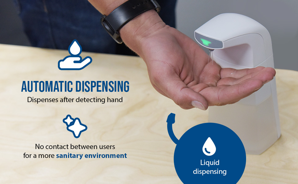 An automatic liquid sanitizer is the perfect asset to maximize cleanliness. The plastic construction lends itself well to portability and simple movement from area to area. The automatic dispense feature allows for multiple individuals to obtain sanitizer without coming in contact with the bottle itself. The large volume capacity is simple to fill and efficiently manages the flow of liquid per dispensing. Automatic dispense is battery operated.