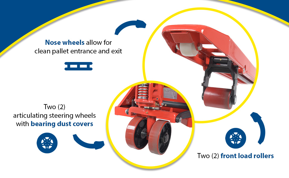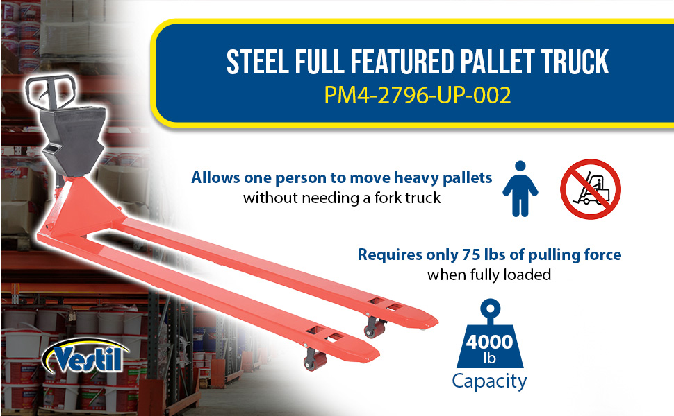 PM4-2796-UP-001 PM4-2796-UP-001Steel/Plastic Pallet Truck 109-3/16 In. x 27 In. x 48 In. 4000 Lb. Capacity Red with Yellow P-CaddyUniform Capacity (lb.): 4000