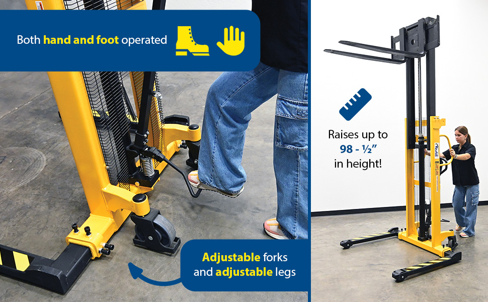 | Steel Manual Stacker Narrow Mast Adjustable Forks/Legs 1,000 Lb. Capacity Black / Yellow | Uniform Capacity (lb.): 1,000 Service Range (in.): 2-1/8 to 62 | 472 |