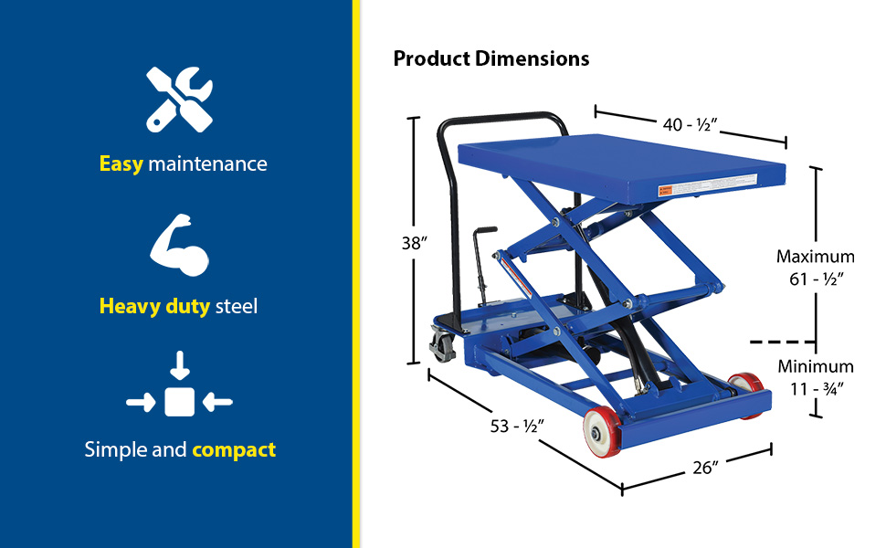 Constructed of heavy duty steel and designed to withstand the most demanding industrial environments. Ideal for lifting and transporting loads, order-picking, die handling, and for use in support of assembly operations. Little exertion is required to raise and lower the deck with the high quality, foot-actuated, single-speed hydraulic pump. The hydraulic system is equipped with an overload protection valve. The hand operated carts have safety stops to prevent an empty deck from lowering while performing maintenance. The foot operated carts have a unique tilt-up table top that allows for safe and easy maintenance. Two (2) rigid front casters and two (2) rear swivel polyurethane casters with brake provide a high degree of maneuverability; each swivel wheel is protected by guards and is equipped with brakes.