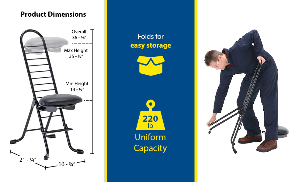 The CPRO-800LP model is not only convenient but easy to use. Simply unfold the rear legs and slide the contoured padded seat to the desired ergonomic height using the infinite adjustment for optimum work posture. Folds up to a 4" profile for easy portability and storage.