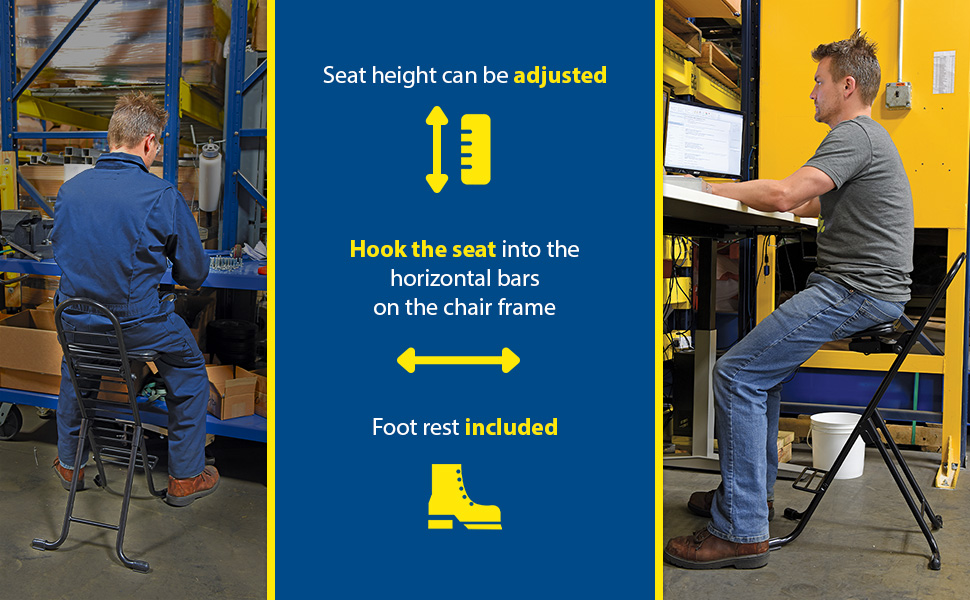Ideal for any industrial environment. The CPRO-600, CPRO-600S, CPRO-200, and CPRO-100 models are adjustable in 2" increments from a low crouch to a standing position with the simple cross bar attachment design. The units are constructed with four rubber "shocks" under the seat base which allows the seat to tilt forward, left, and right so it can accommodate our body movements and a more natural posture position. Additionally the CPRO-600S model features a swivel seat for added maneuverability, while, the CPRO-100 includes casters for portability from work station to work station.