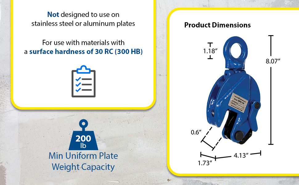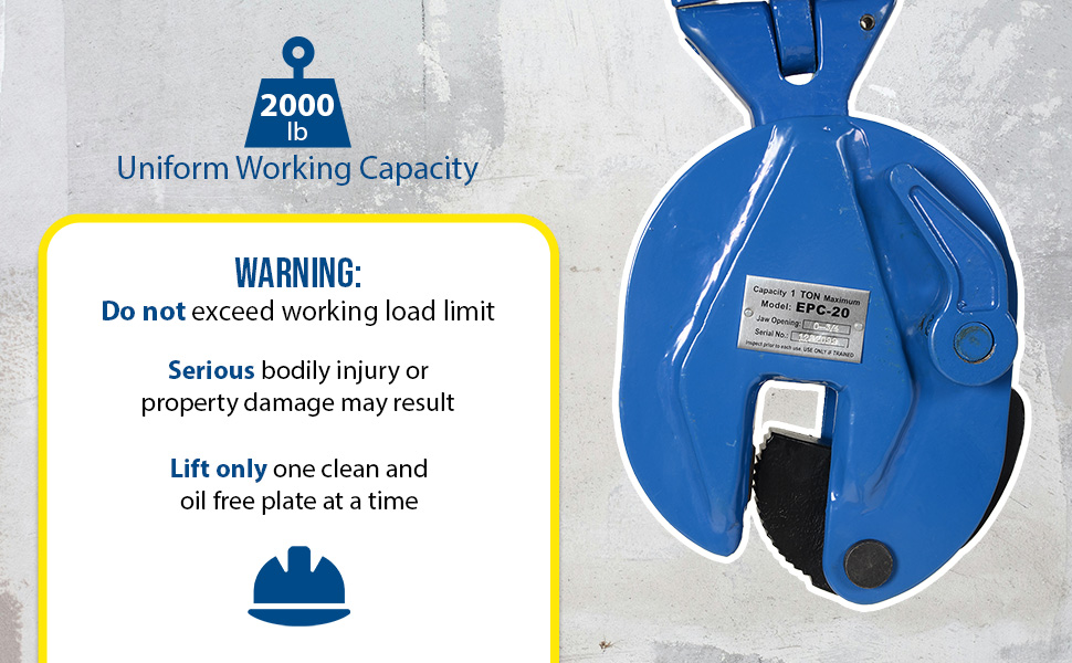 EPC-20 EPC-20Steel Vertical Plate Clamp 2,000 Lb. Capacity BlueMin Uniform Plate Weight (lb.): 400