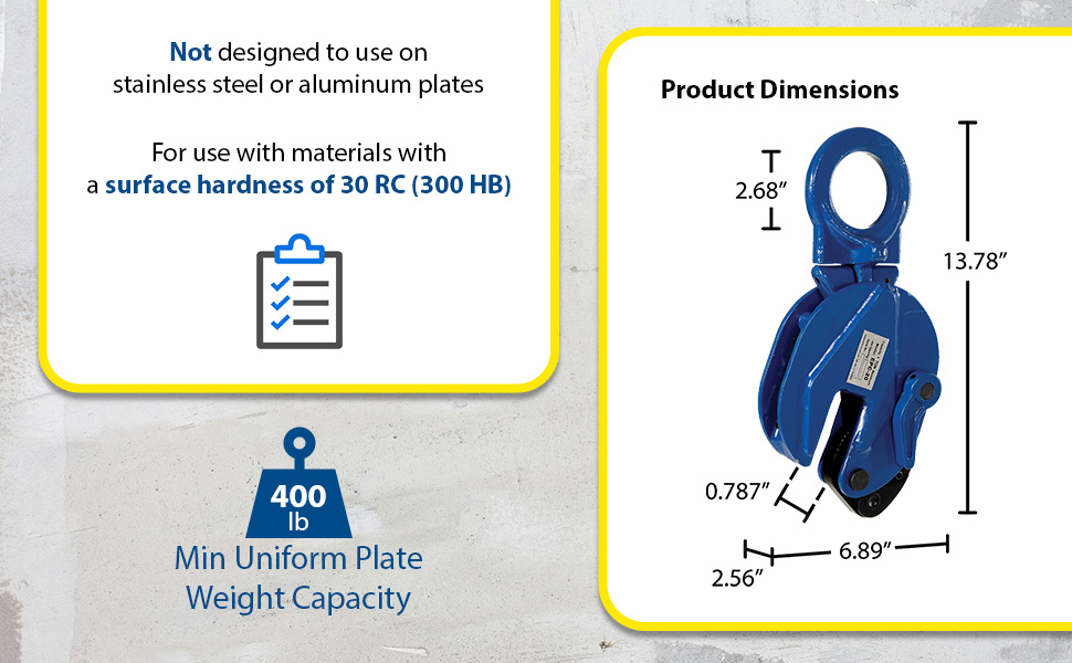 Pivoting bale for easier and more versatile operation. Automatic serrated hardened steel cams and pads. Drop-forged steel case for maximum strength. Designed to meet ASME B30.20. Warning: Do not exceed the working load limit. Serious bodily injury or property damage may result. Do not use plate clamps to lift loads less than 20% of rated capacity. Lift only one plate at a time. Plate must be clean and free of oil. Not designed to use on stainless steel or aluminum plates. For use with materials with a surface hardness of 30 RC (300 HB).