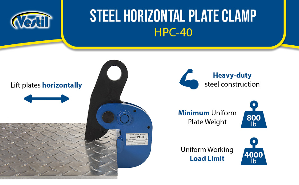 HPC-40 HPC-40Steel Horizontal Plate Clamp 4,000 Lb. Capacity BlueUniform Working Load Limit (lb.): 4,000