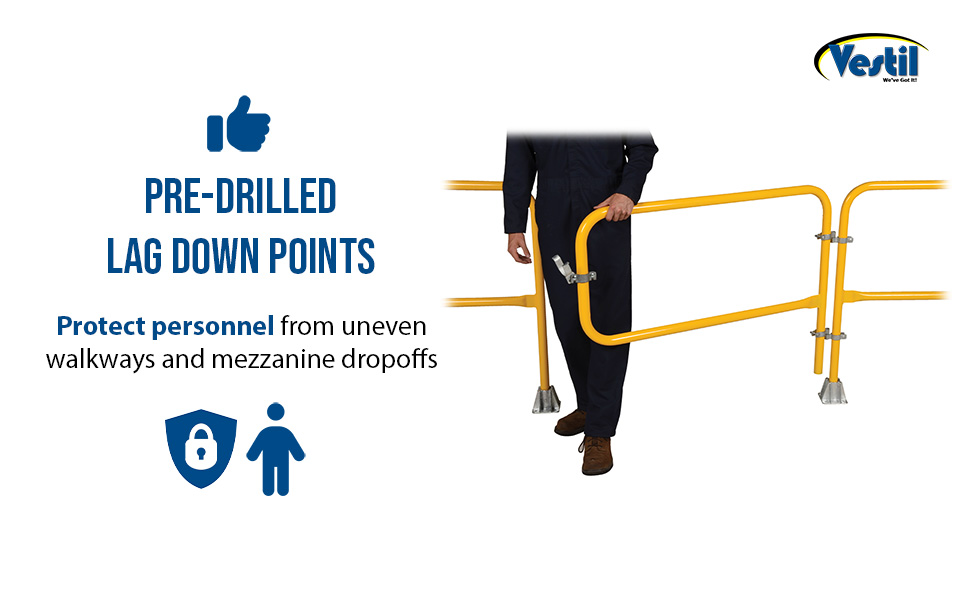 Protect people from uneven walkways and mezzanine drop-off's. The safety railing is constructed of schedule 10 steel. All models have an outside pipe diameter of 1-5/8". Handrails are 42" high with a 21" mid-rail. Mounting options include socket sleeves, cast steel base, barricade base, or cast steel sockets for convenient handrail removal. The cast steel sockets accept wood 2" x 4" or 2" x 6" when toe boards are required. Two (2) lag down holes are pre-drilled for permanently mounting the railing. The steel design includes a baked-in powder-coated finish, which is available in a variety of colors found in the table below. The VDKR series safety rail products comply with U.S. Occupational Safety and Health Administration (OSHA) General Industry requirements for guardrail systems in 29 CFR 1910.29.