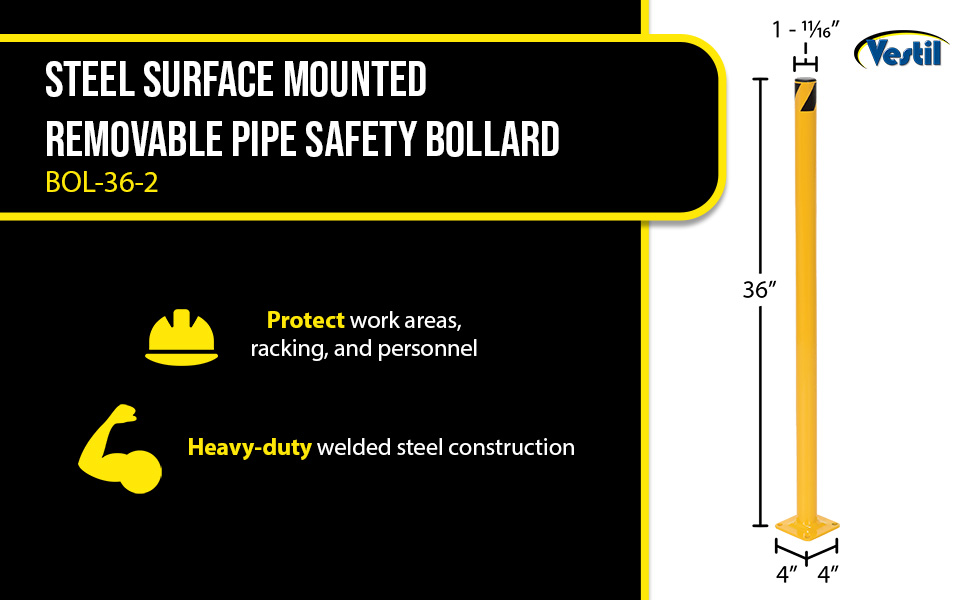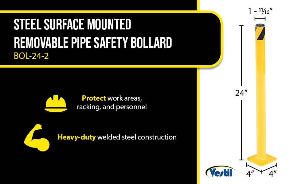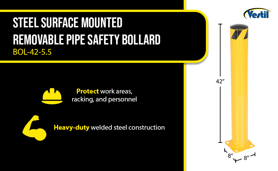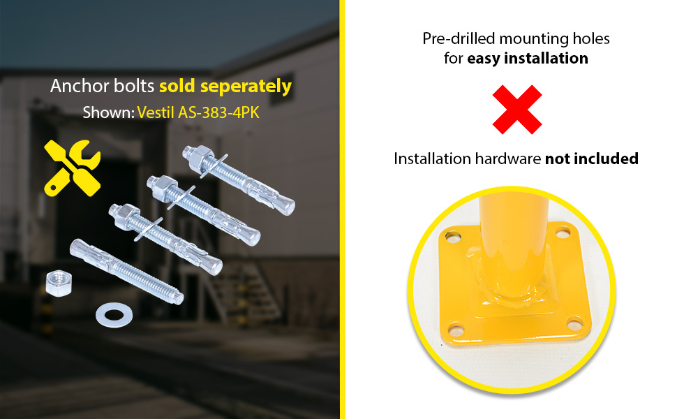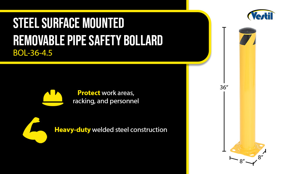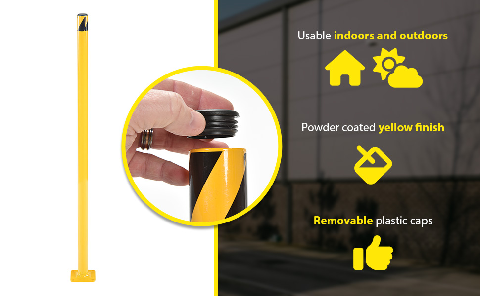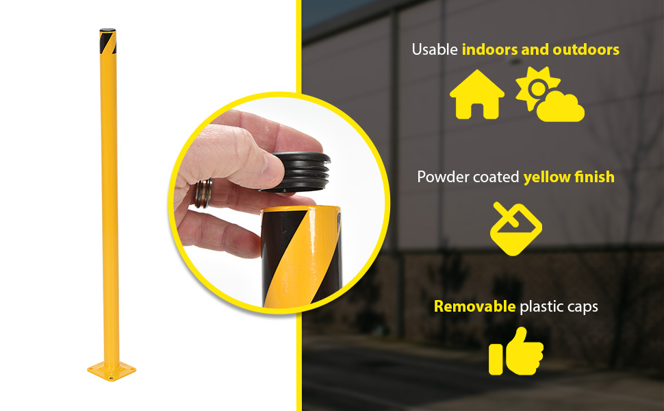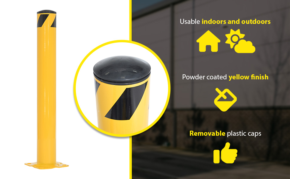 Bollards can be used both indoors and outdoors to protect work areas, racking and personnel. Caps are made of plastic and are removable when necessary. Bollards may be filled with concrete. Base plate includes four (4) pre-drilled mounting holes. Mounting kits and replacement caps available. Baked in powder coat or hot dipped galvanized finish for added toughness.