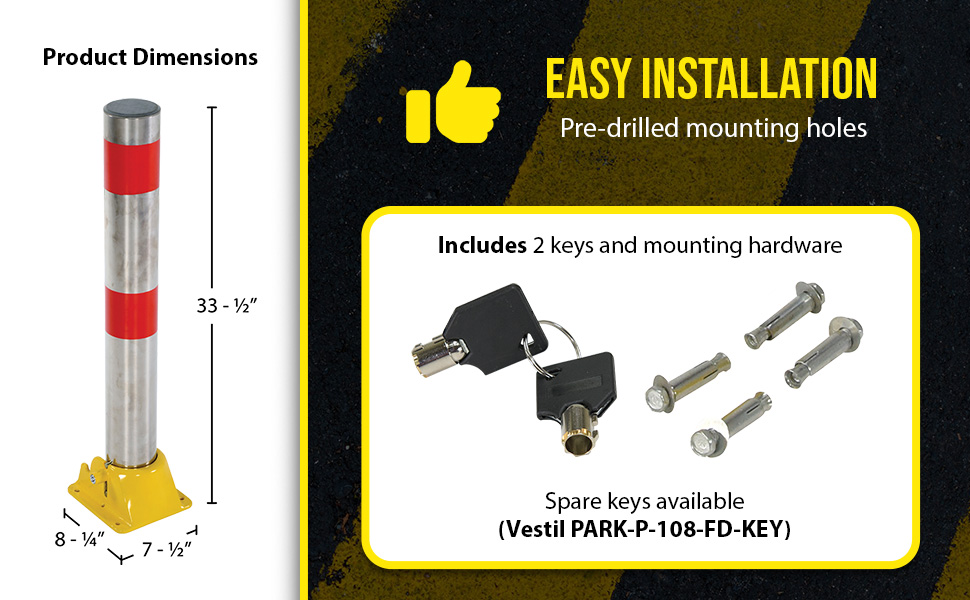 Ideal for vehicle access control. These heavy duty bollards feature integrated locking and an easy to operate cam-lock. Unit secures in open position via internal lock. Two (2) keys included. Four (4) 3/8" x 3" concrete anchors included for securing bollard to concrete. Two (2) wrap around reflectors adhere to the baked-in powder-coated toughness or stainless steel finish. The anti-tamper design and cast steel covering foot is made in a mold, therefore there are no welds. Can be used in conjunction with our Fixed Height Bollards.