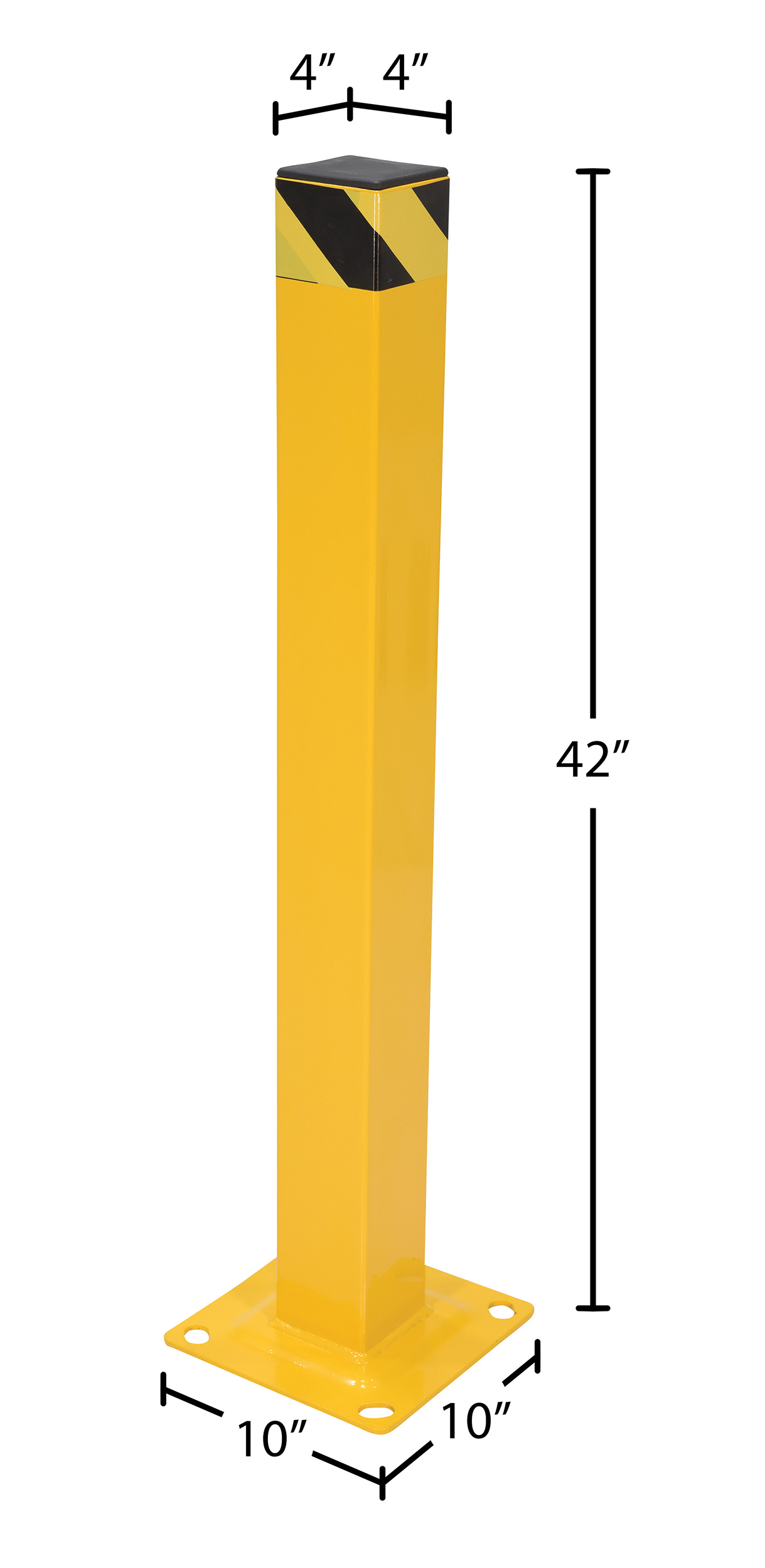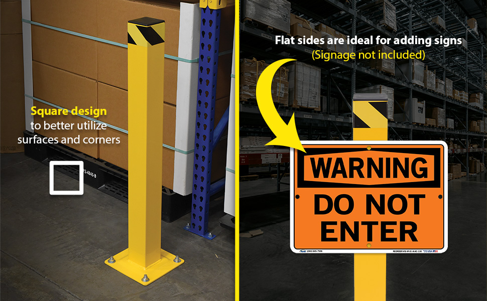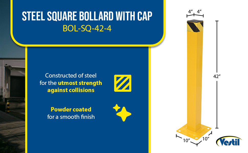 The Square Bollard is perfect for an array of industrial setting, both indoors and outside. Constructed of steel for the utmost strength against collisions. It is also powder coated for a smooth finish and a quality appearance. The square design allows the user to better utilize surface space, while also securing vulnerable corners of structures. Pre-drilled mounting holes are included for simple installation.