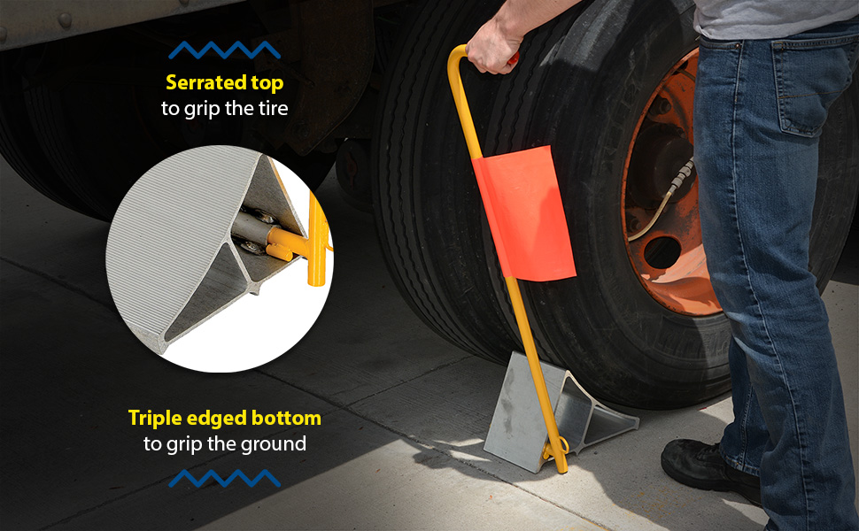FAB-10-ERGO-FL FAB-10-ERGO-FLFabricated Steel Wheel Chock With Ergonomic Handle and Flag YellowUsable Chock Width (in.): 9-13/16