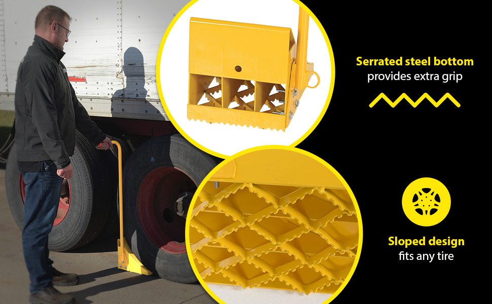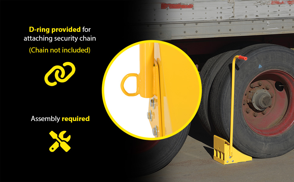 Ergonomically designed to make it easy to move wheel chocks in and out of position under trailer wheels. Reduce the risk of back, knee, and foot injuries. Handle is constructed of steel and includes a yellow baked-in powder-coated toughness. D-Ring provided for attaching security chain (chain not included.) Assembly required.