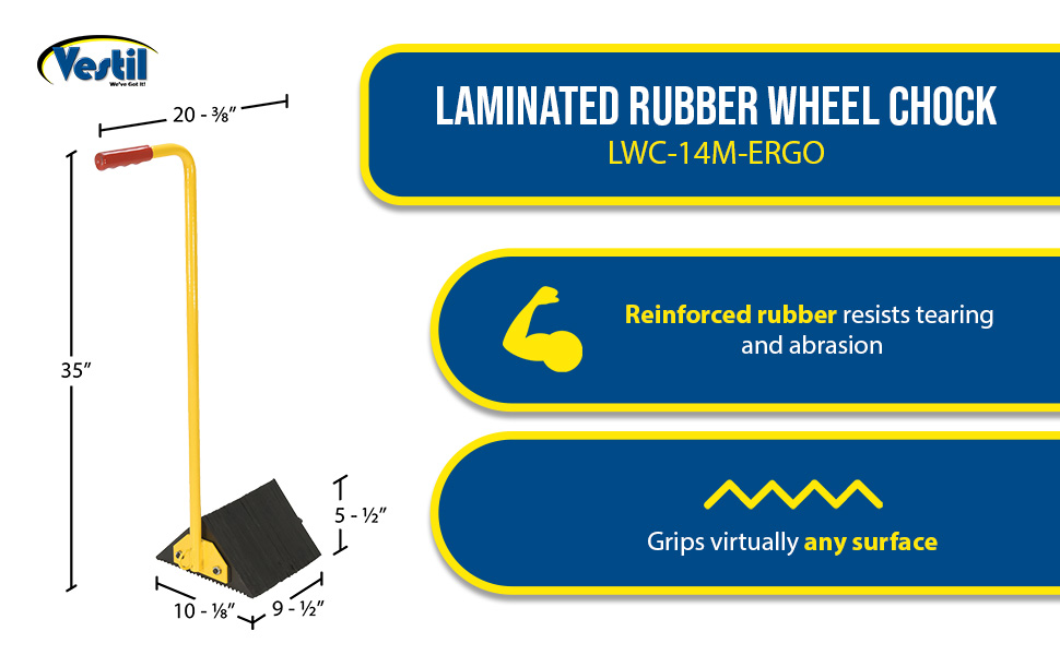 LWC-14M-ERGO LWC-14M-ERGOLaminated Rubber Wheel Chock with Ergonomic Handle 10-1/8 In. x 20-3/16 In. x 34-15/16 In. Black / YellowUsable Chock Width (in.): 9-1/2