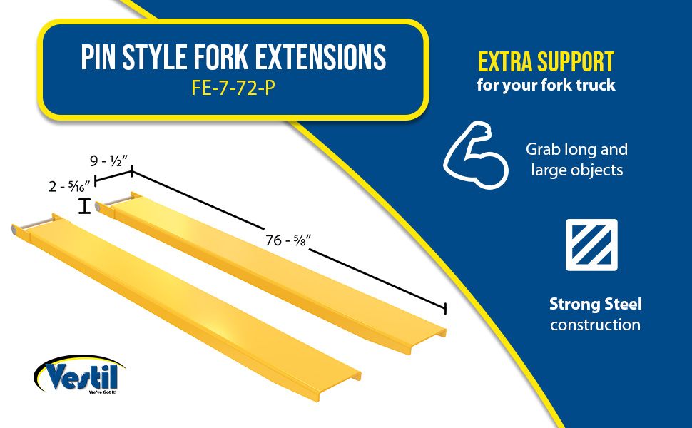 FE-5-72-P FE-5-72-PSteel Pin Style Fork Extensions 5 In. x 72 In. 4,000 Lb. Capacity YellowUniform Capacity Per Pair (lb.): 4,000