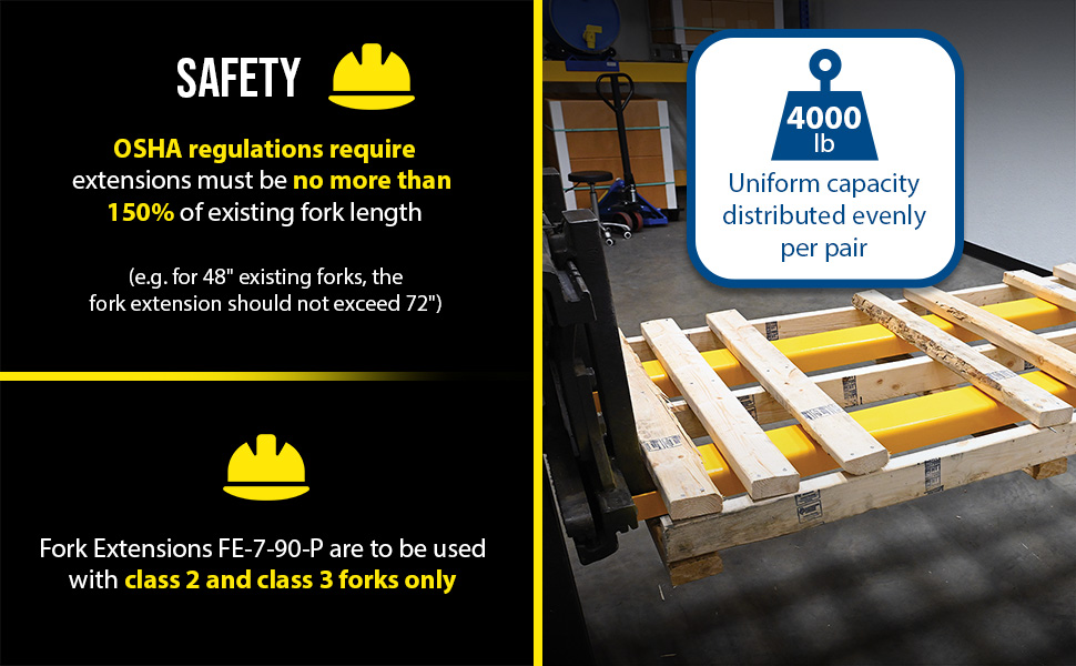 FE-7-96-P FE-7-96-PSteel Pin Style Fork Extensions 7 In. x 96 In. 4,000 Lb. Capacity YellowUniform Capacity Per Pair (lb.): 4,000