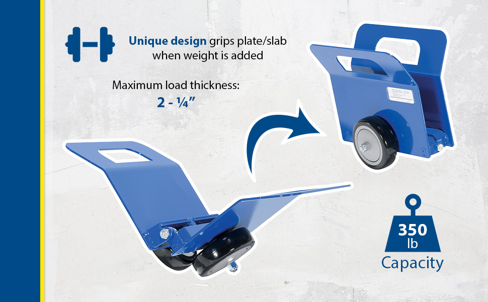 Lightweight door and panel dolly with auto-clamp feature. Unique design grips plate/slab when weight is added. Opening for use with maximum 2-1/4" thick plate/slab. Steel construction with baked in blue powder coat finish for added toughness.