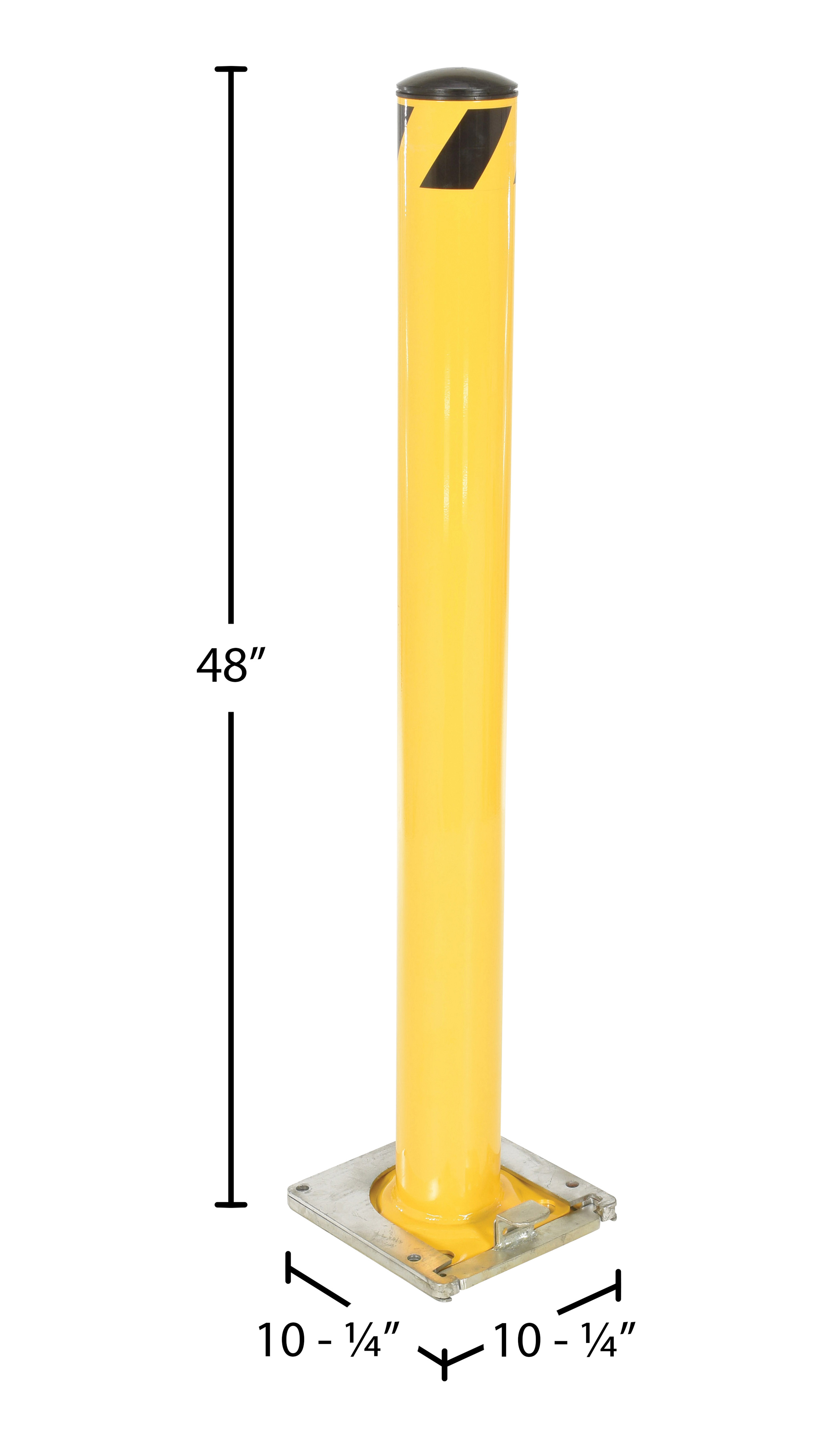 Steel Surface Mounted Removable Pipe Safety Bollard 48 In. x 4-1/2 In. YellowThis steel pipe safety bollard can be used both indoors and outdoors to protect work areas, racking and personnel. Surface mounted steel base plate allows for quick and easy bollard removal. Steel base plate is bolted in place. Guard is easily inserted into base plate then locked in place. Base plate includes pre-drilled mounting holes. Plastic caps are removable. Powder coated safety yellow finish. Welded steel construction.