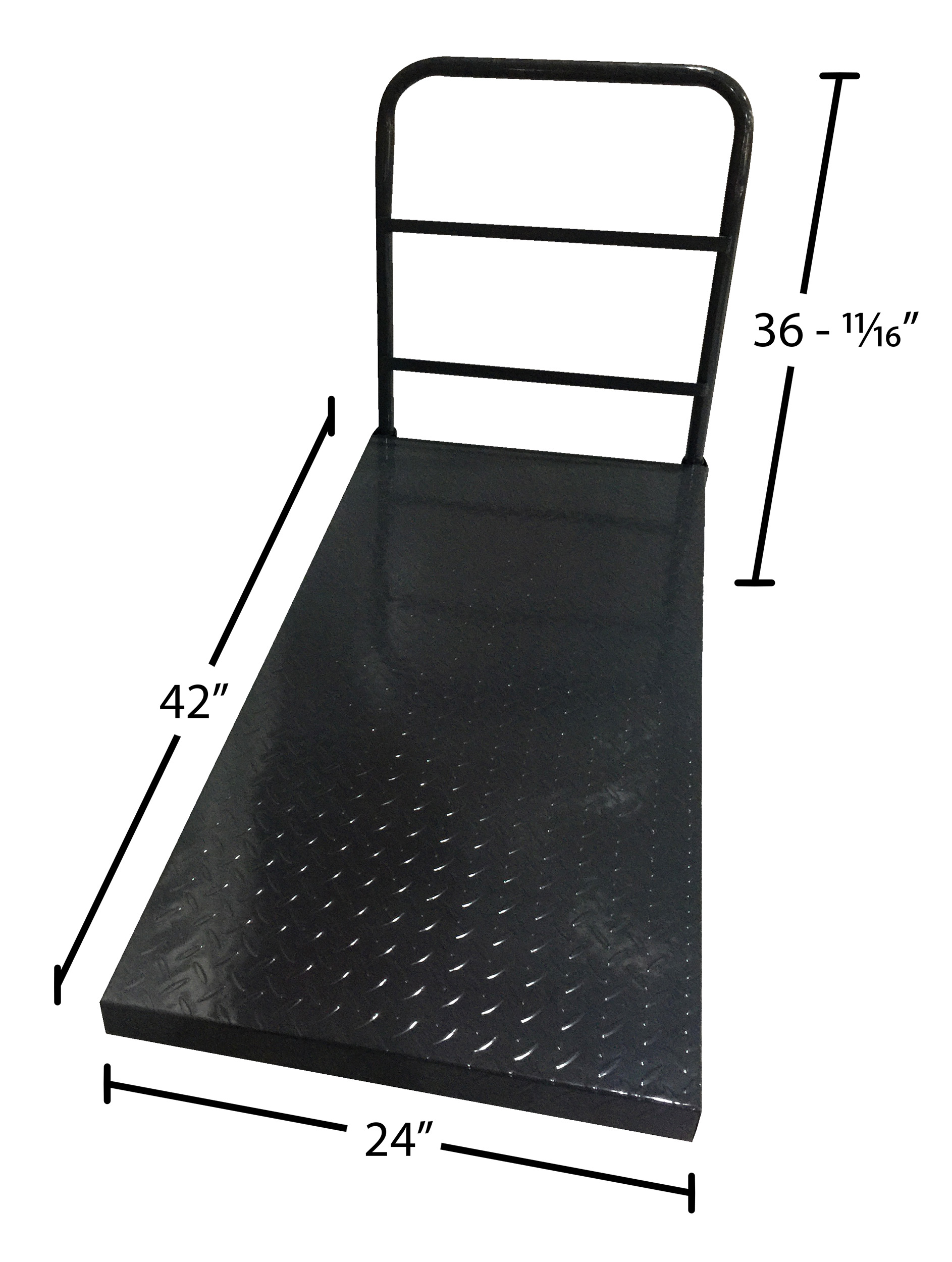 Steel Tread Plate Platform Truck 24 In. x 36 In. 2000 Lb. Capacity BlackA steel tread plate on a platform truck is an upgrade to an old classic. The tread plate design provides the user with a better sense of security. With this added texture, the amount of jostling and movement by the products on the platform is limited. The steel handle allows the user to maintain an ergonomic posture while transferring goods. Mold on rubber casters roll smoothly. Powder coated finish provides added toughness.