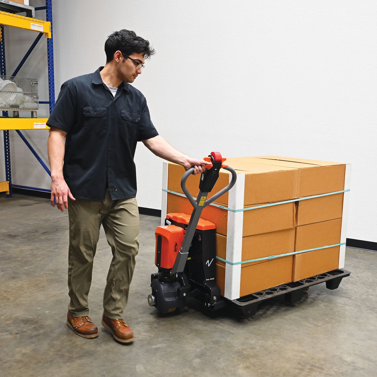 Steel Electric Pallet Truck With Powered Brakes 27 In. x 45 In. 3,300 Lb. Capacity Black/RedThe electric pallet truck is the perfect change from the manual design. This construction design is built to last, withstand rugged daily use, and diminish manual labor. Multi-function capabilities such as the raise and lower buttons and emergency brake are located in the handle. The design of the handle is also ergonomically friendly, minimizing awkward slouching when maneuvering. All areas are easily accessible for general upkeep and cleaning. Truck can be used with the handle in the upright position for utilization in the small areas. Horn is also included. This model includes powered brakes, which lessens strain on workers and increases workplace safety.