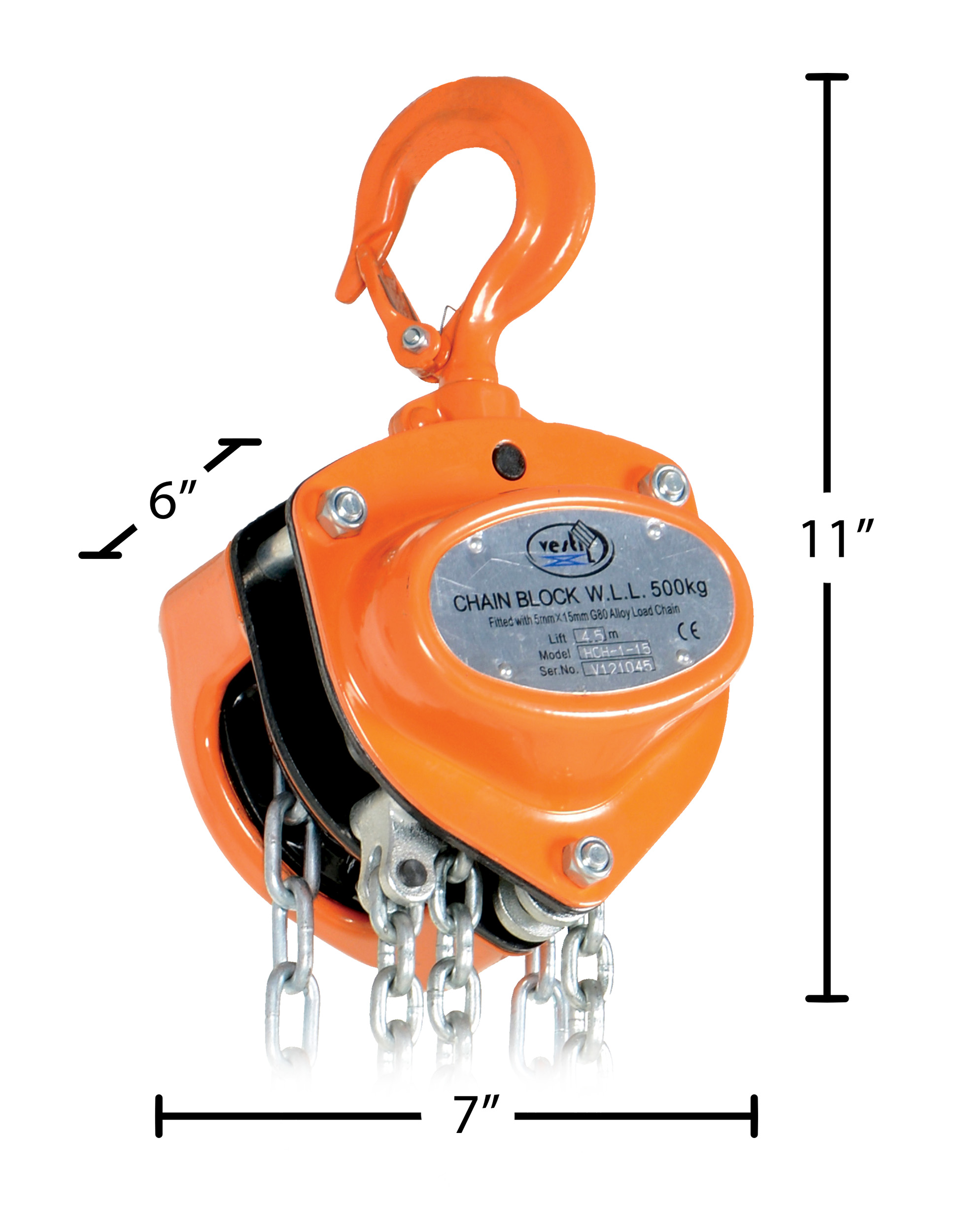 Steel Manual Chain Hoist 15 Ft. Lift 1,000 Lb. Capacity OrangeThis portable, lightweight hand Chain Hoist is durable and easy to operate. Compact design and low headroom allow installation in confined areas. Enclosed double ratchet pawls with self adjusting disc brake standard. Designed with a safety factory four (4) times rated capacity. Individually tested at 150% rated capacity. Features black chain tempered to ISO 3077, pull chain, hardened two-stage gears and forged steel upper and lower hooks with safety latches. Constructed of high quality steel components ideal for industrial applications.