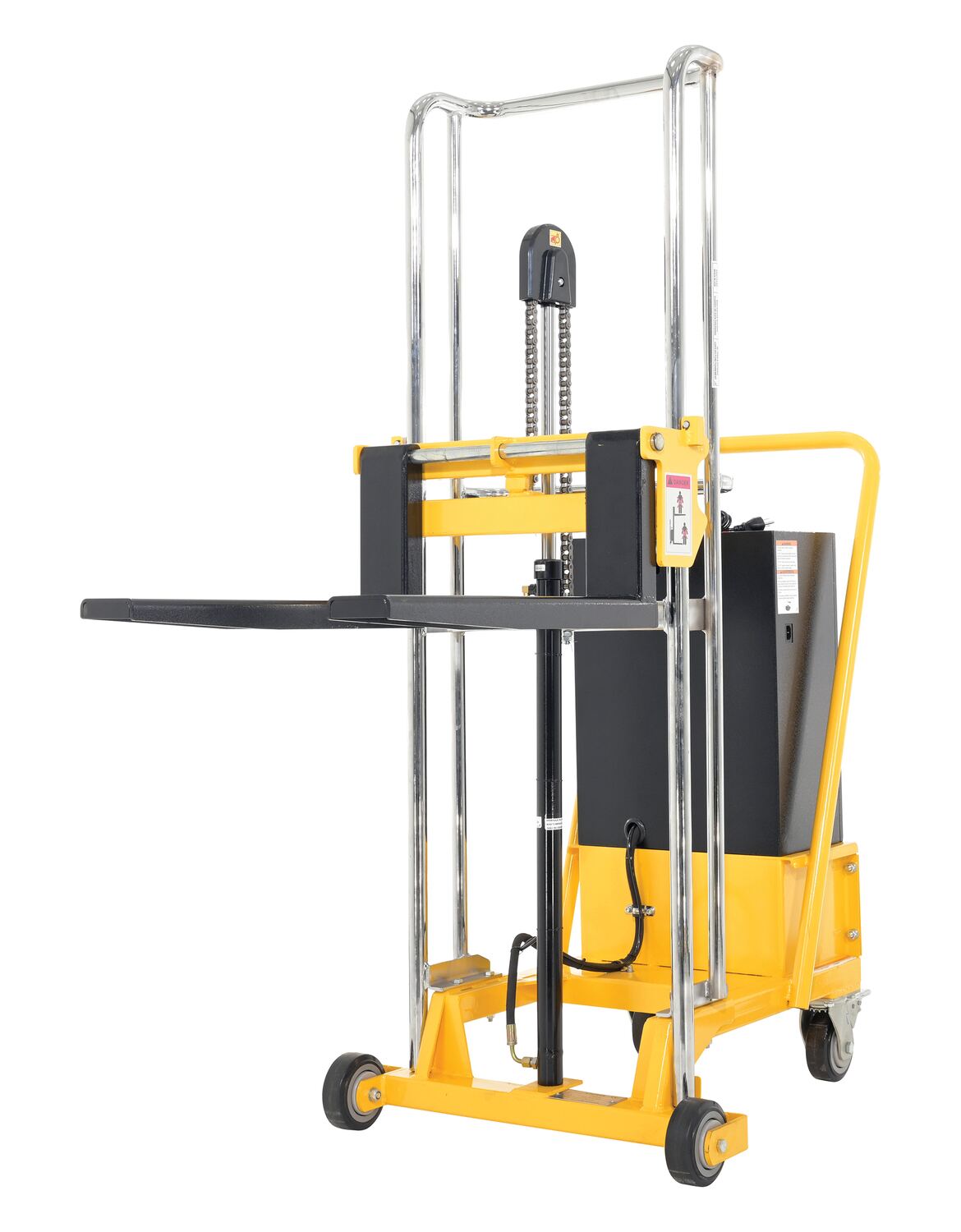 Steel Counter Balanced Hefti-Lift 68 In. x 68-3/4 In. 550 Lb. Capacity Yellow / BlackDC powered portable hydraulic lifts are user friendly providing reliable, powerful lifting when moving and positioning loads. Units roll easily on two rigid and two swivel poly-on-steel casters and include a foot operated brake. Not for use with pallets. All welded steel construction with chrome uprights. Variety of attachments available.