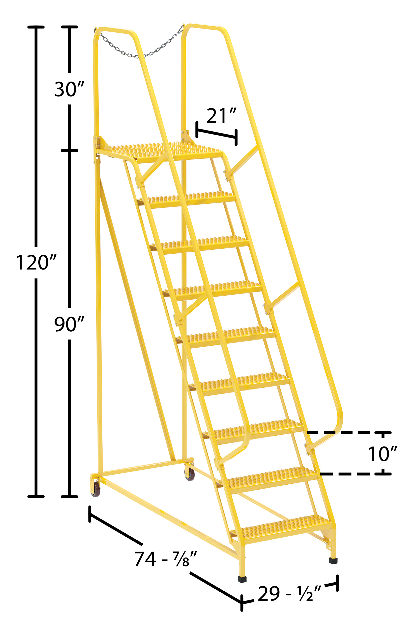 Steel Maintenance Ladder 58 Degree 9 Grip Strut 24 In. Step Width 350 Lb. Capacity YellowPortable maintenance ladder for use around a variety of stores and inventory rooms. Constructed of square tubing framework, which handles uniform capacities up to 350 lbs. hand railing provides user safety while ascending or descending the unit. Distance between steps is 10". Powder coated finish for baked in added toughness.