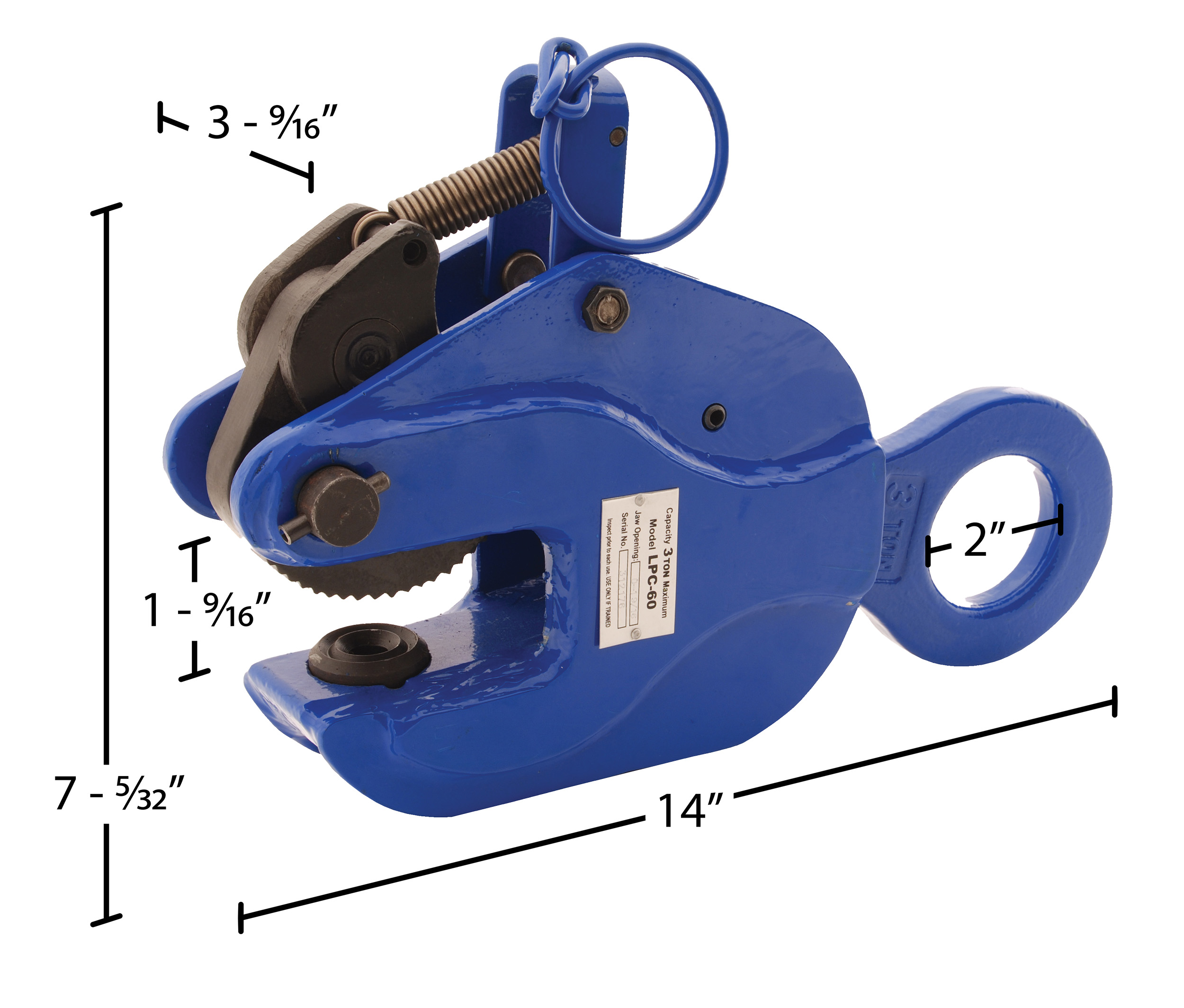 Steel Vertical Positive Locking Plate Clamp 15 In. x 4 In. x 8 In. 6000 Lb. Capacity BlueThe vertical positive locking plate clamp grips a sheet until release ring is pulled. Serrated gripper is hardened tool steel. Forged head and gear. Lift only one (1) clean, oil free plate at a time. Safety factor is 2 to 1. Not designed to use on stainless steel or aluminum plates. For use with materials with a surface hardness to 30 RC (300 HB).