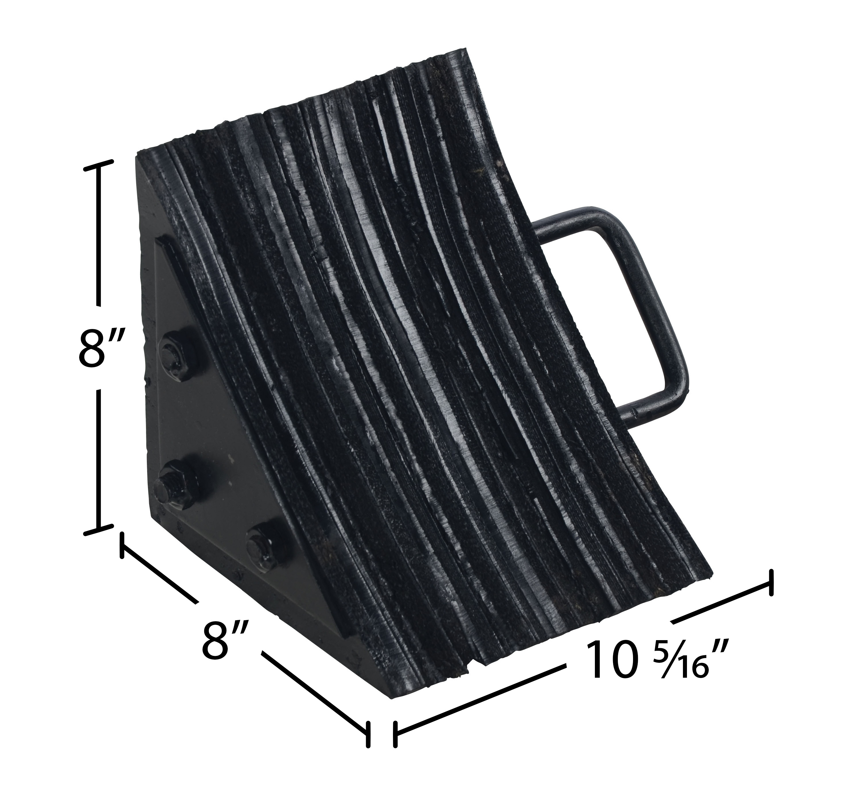 Laminated Rubber Wheel Chock 8 In. x 10-5/16 In. x 8 In. BlackThe rubber Wheel Chock is constructed of reinforced rubber to provide a sure grip on virtually any surface. The curved surface contours to fit tires. Rubber resists tearing, abrasion, ozone weathering, etc. The functional design is durable in all weather conditions.