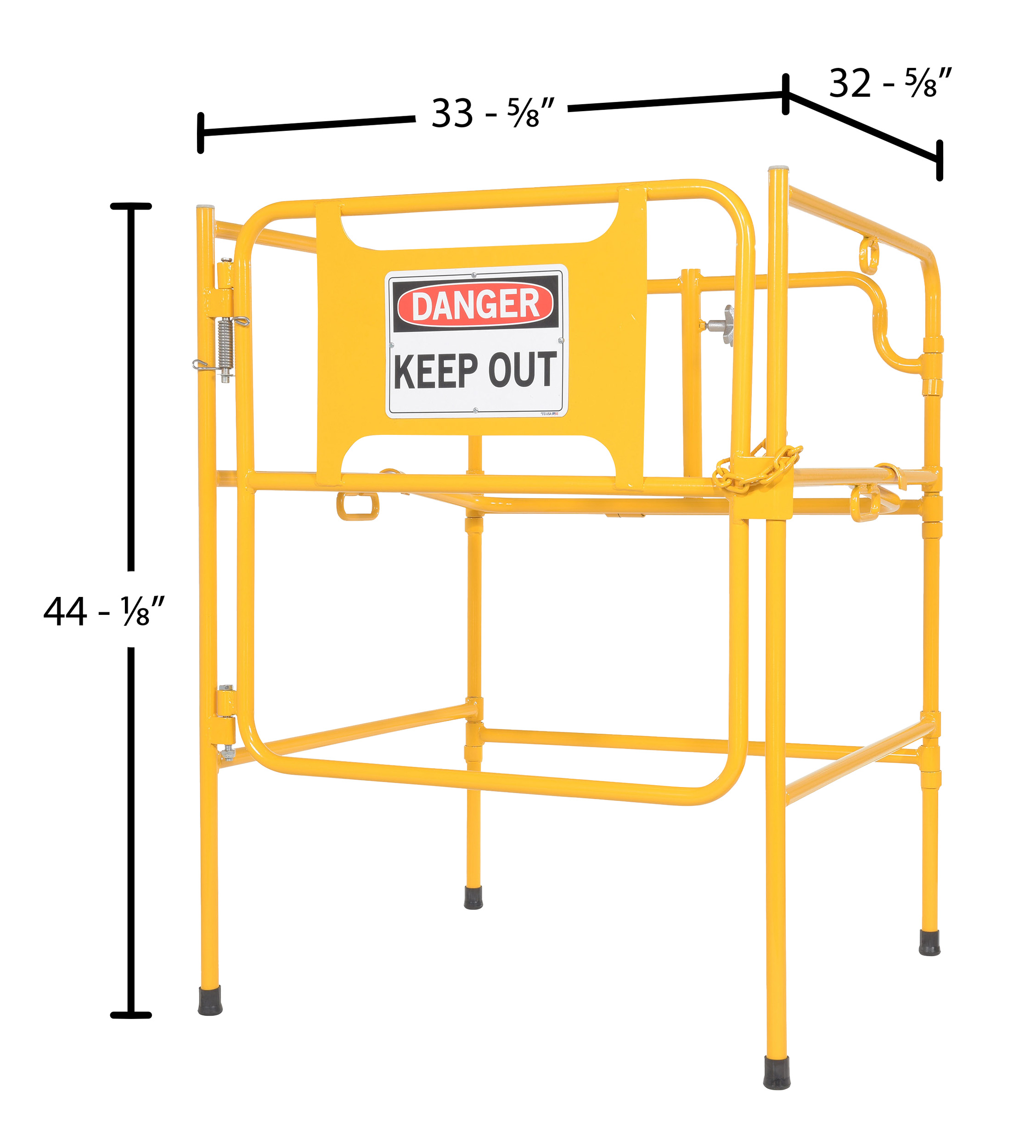 Steel Manhole Guard Rail with Aluminum Sign 31 In. x 30 In. Danger Keep Out Sign Message YellowThe manhole guard rail with Aluminum sign is perfect for utility maintenance and city officials. The simple set up and take down promotes quick use when on the go and a compact storage when not in use. High rails and an attaching chain limit access and promote safety to the worker in the enclosed area. A brightly colored high strength construction makes the unit highly visible, giving caution to pedestrians and other workers to keep their distance.