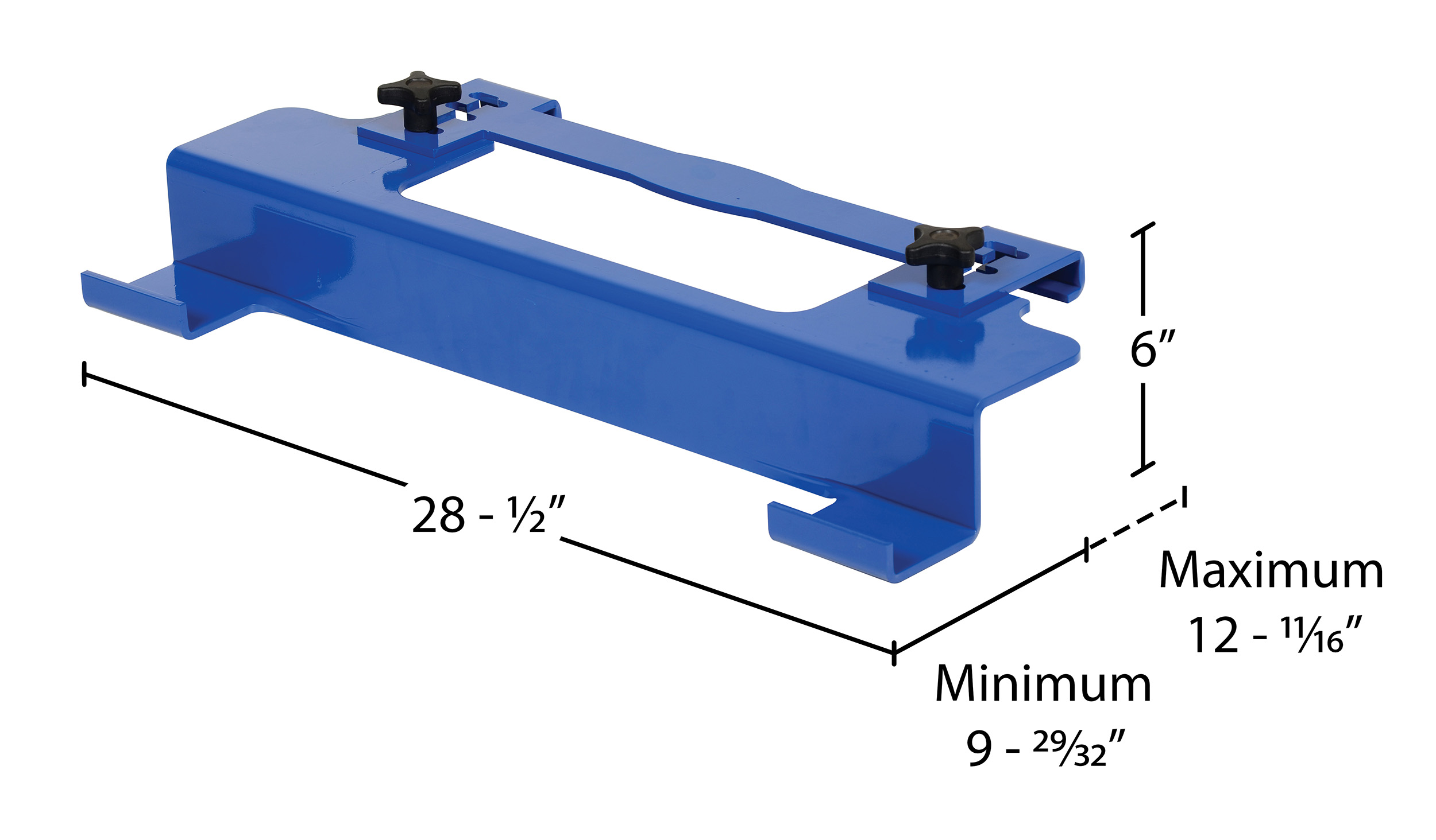 Steel Adjustable Depth Pallet Jockey 12-11/16 In. x 28-1/2 In. x 6 In. 4000 Lb. Capacity BlueThe adjustable unit is designed to fit various types of electric pallet jacks. The steel construction is strong and durable for heavy lifting on a day to day basis. To use simply loosen wing bolts and slide adjustable brackets to proper slot, then tighten wing bolts.