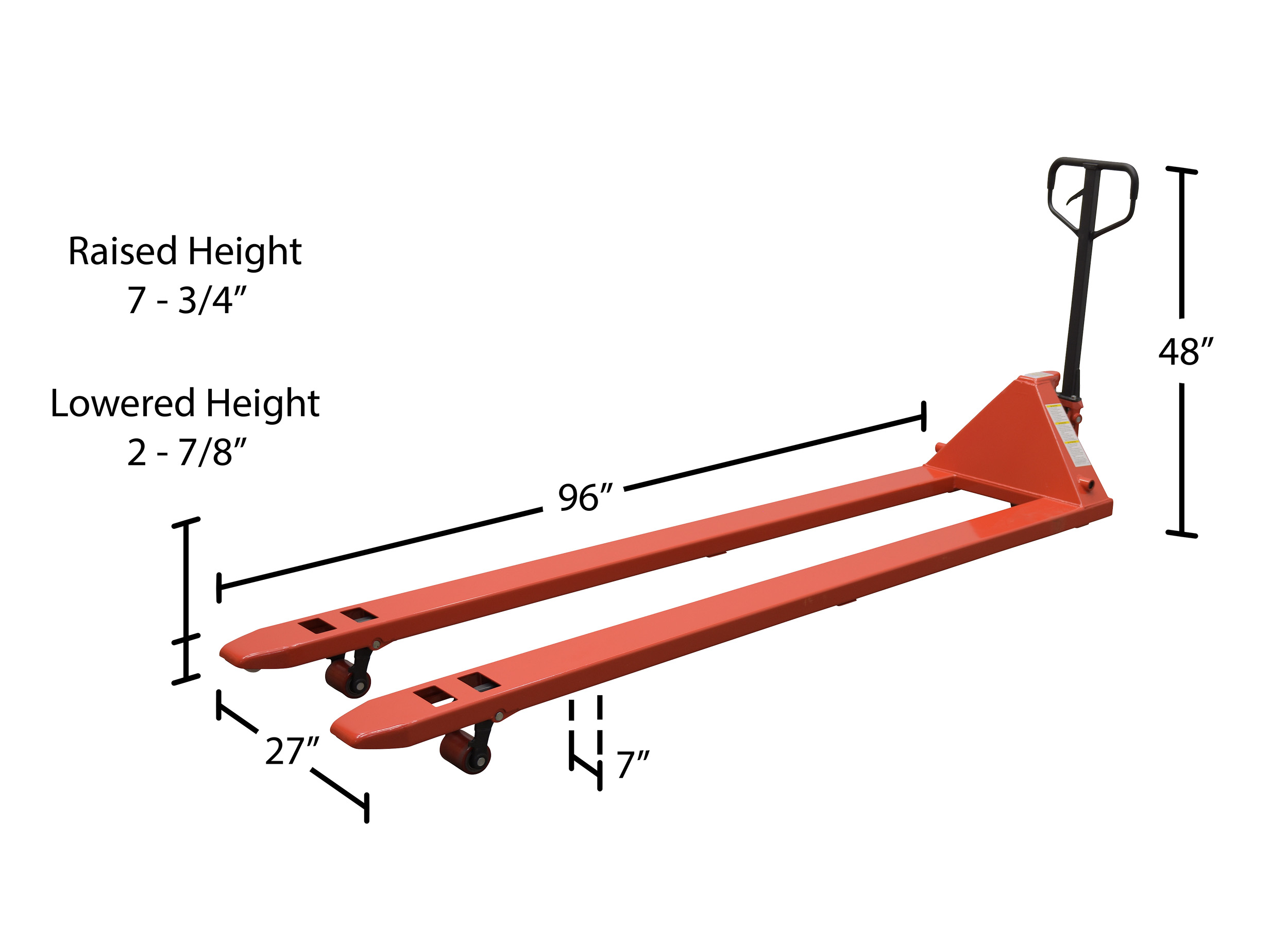 Steel Full Featured Pallet Truck 112 In. x 27 In. x 48 In. 4000 Lb. Capacity RedThe full featured pallet truck is an economical way for one person to move heavy pallet loads without the use of a fork truck! Includes two (2) articulating steering wheels and two (2) front load rollers. The ergonomic design requires only seventy-five (75) pounds of pulling force when fully loaded. Steering wheels include bearing dust covers for added life. Nose wheels are located on the front edge of each fork to assist in clean pallet entrance and exit. Reinforced triple-formed steel forks provide twice the strength of standard single-formed forks. The unit is equipped with internally mounted solid steel adjustable push rods. The spring loaded handle automatically returns to vertical position when not in use. Hydraulic pump design facilitates easy-access seal replacement. Chrome-plated hydraulic pump piston for long seal life.