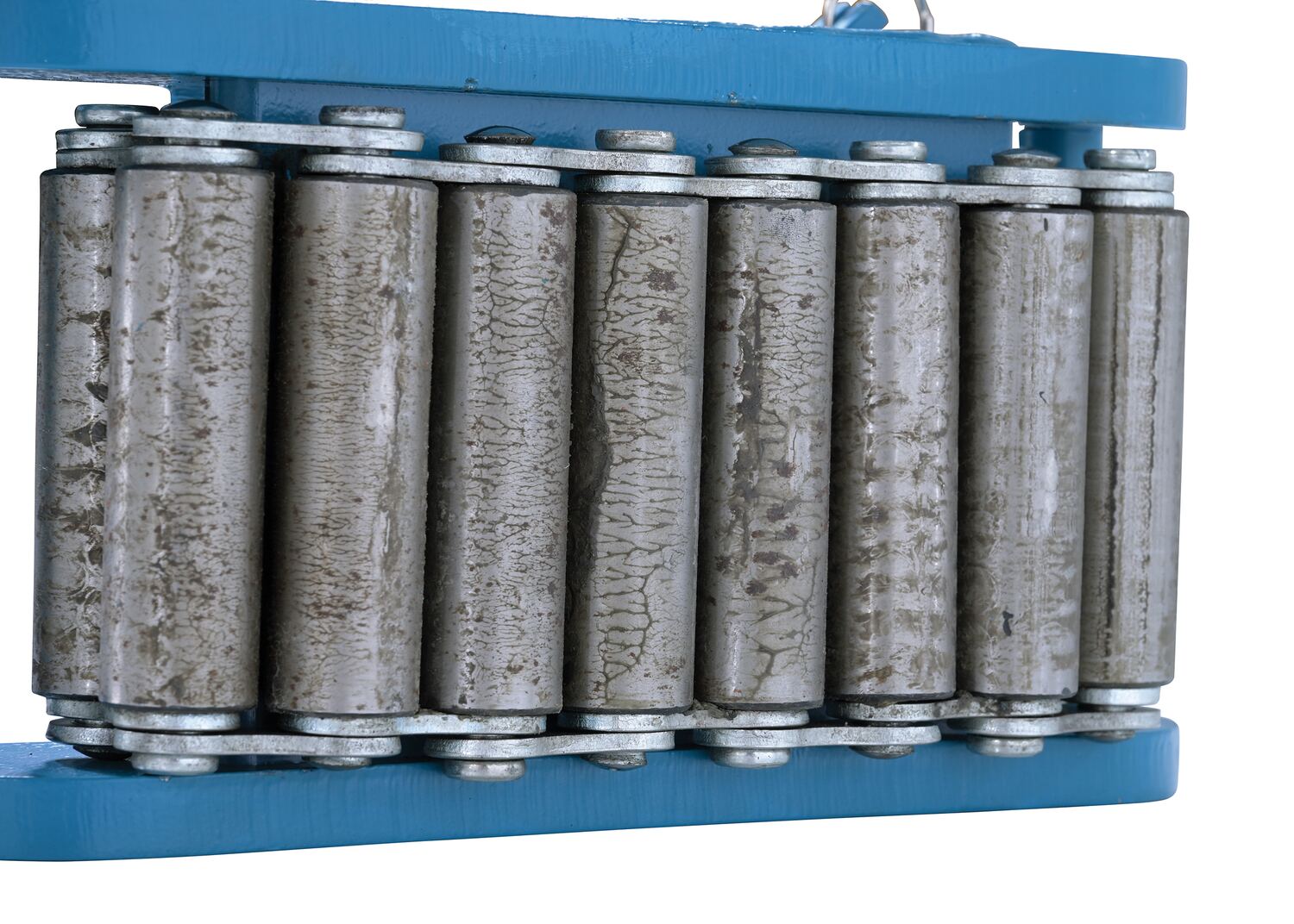 Made of high-strength annealed ductile iron, this steel machine roller has swivel tops that rotate three hundred sixty degrees (360 degrees) on chrome steel ball bearings to allow for easier turning. The rollers form a "tank track" to revolve around a center load bearing plate in the frame to provide maximum maneuverability. The weight of the load is transferred directly from the load bearing plate to the rollers, eliminating axle friction and requiring less power to start and move. This unit is virtually maintenance free.