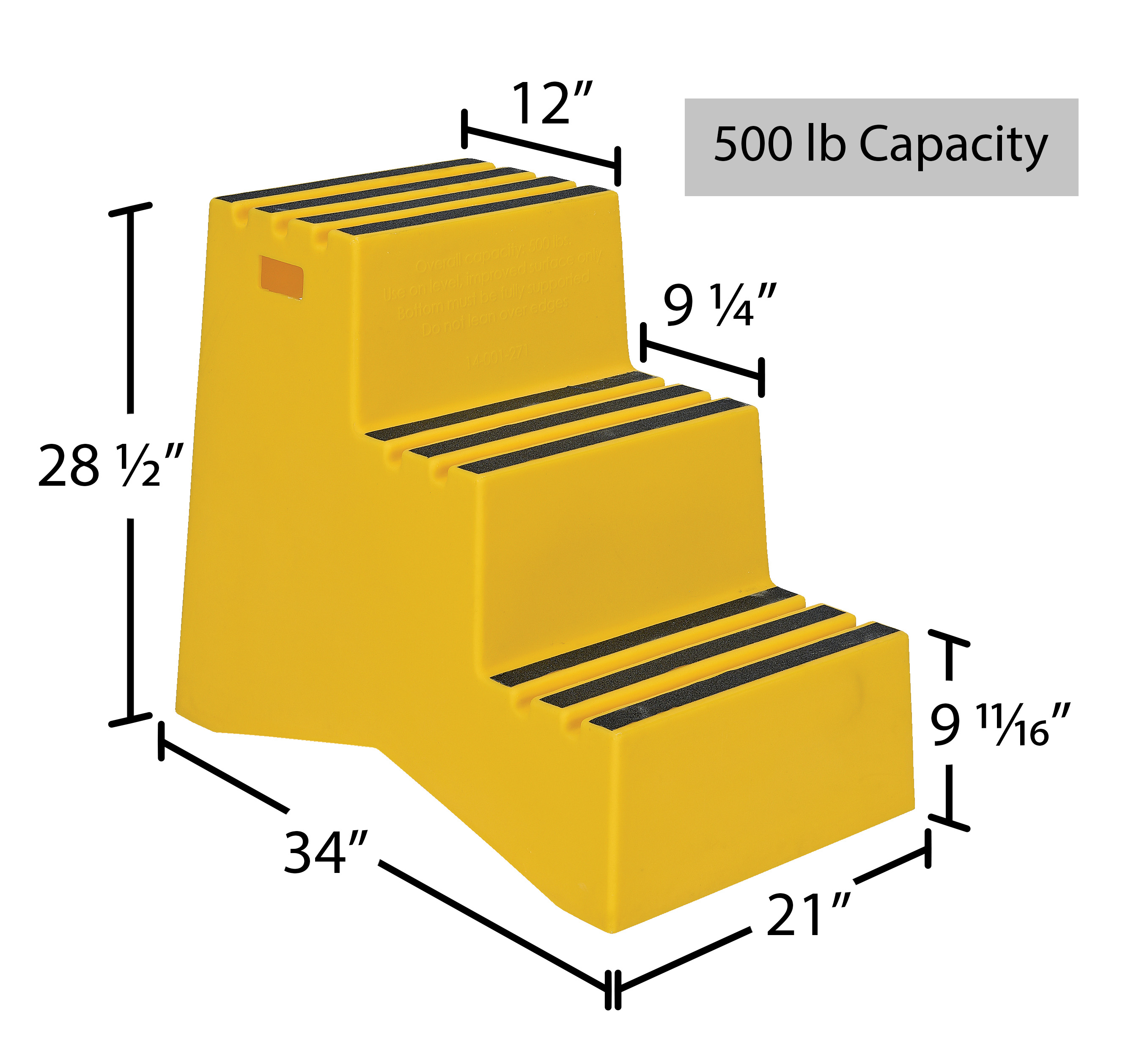 Polyethylene 3-Step Step Stool 500 Lb. Capacity YellowWhen items are out of reach, do not strain, simply step up with this Polyethylene step stool. The three (3) step unit has rear opening access storage compartments. This stool has rubber feet and a non-skid tape surface. Hand holes are standard for easy one person transportation.